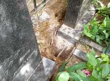 Два покосившихся памятника, сломанная калитка ограды, лавочка требующая покраски |